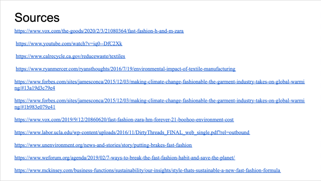 For this first installation, I compiled clothes from my wardrobe that I had purchased in the past from fast fashion companies such as Brandy Melville, Victoria’s Secret, and Levi’s. I arranged them into symbols and words out on my front lawn, photographed each one, and then used Adobe Draw to emphasize each message. Each photo in the slideshow shows the main statistic I wished to convey through my installation.